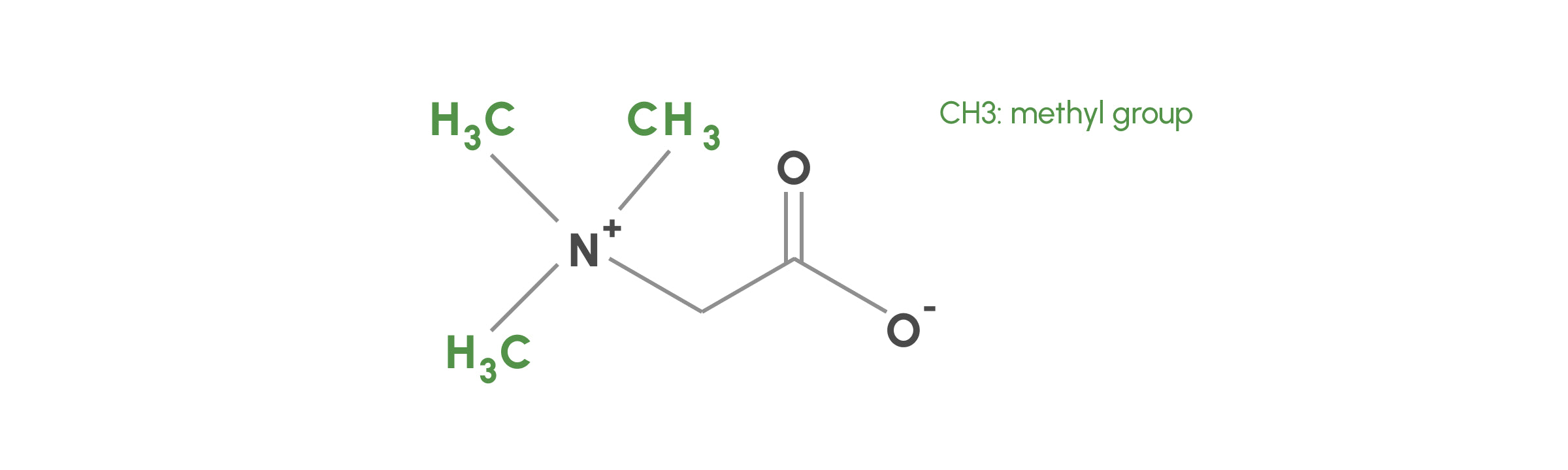 TMG steht für Trimethylglycin, ein langer Name für ein kurzes Molekül. Wie der Name schon sagt, ist TMG Glycin mit drei Methylgruppen (Abbildung 1). Glycin ist eine Aminosäure, ein Baustein von Proteinen. Eine Methylgruppe besteht aus einem Kohlenstoffatom, das von drei Wasserstoffatomen umgeben ist. Wir können TMG selbst synthetisieren. Wir nehmen es auch über die Nahrung auf, insbesondere über Weizenkleie, Weizenkeime, Weizenbrot, Spinat und Rote Bete (1). TMG wurde erstmals in der Roten Bete (Beta bulgaris) entdeckt, daher ist es auch als Betain oder Betainglycin bekannt. Heute sind weitere Betaine erforscht.