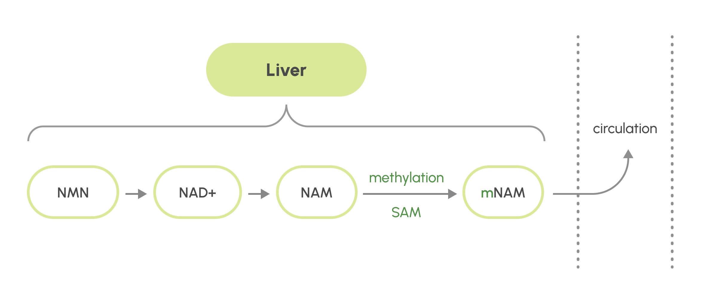 In der Leber interagiert NAD+ mit seinen Partnern (wie Sirtuinen), und ein Teil davon muss in den Blutkreislauf ausgeschieden werden. Hier kommt die Methylierung ins Spiel. Damit NAD+ ausgeschieden werden kann, wird es in NAM umgewandelt, und NAM wird durch Methylierung zu mNAM (Methyl-NAM) (8) ( Abbildung 2) . mNAM ist die Form, die in den Blutkreislauf abgegeben wird.