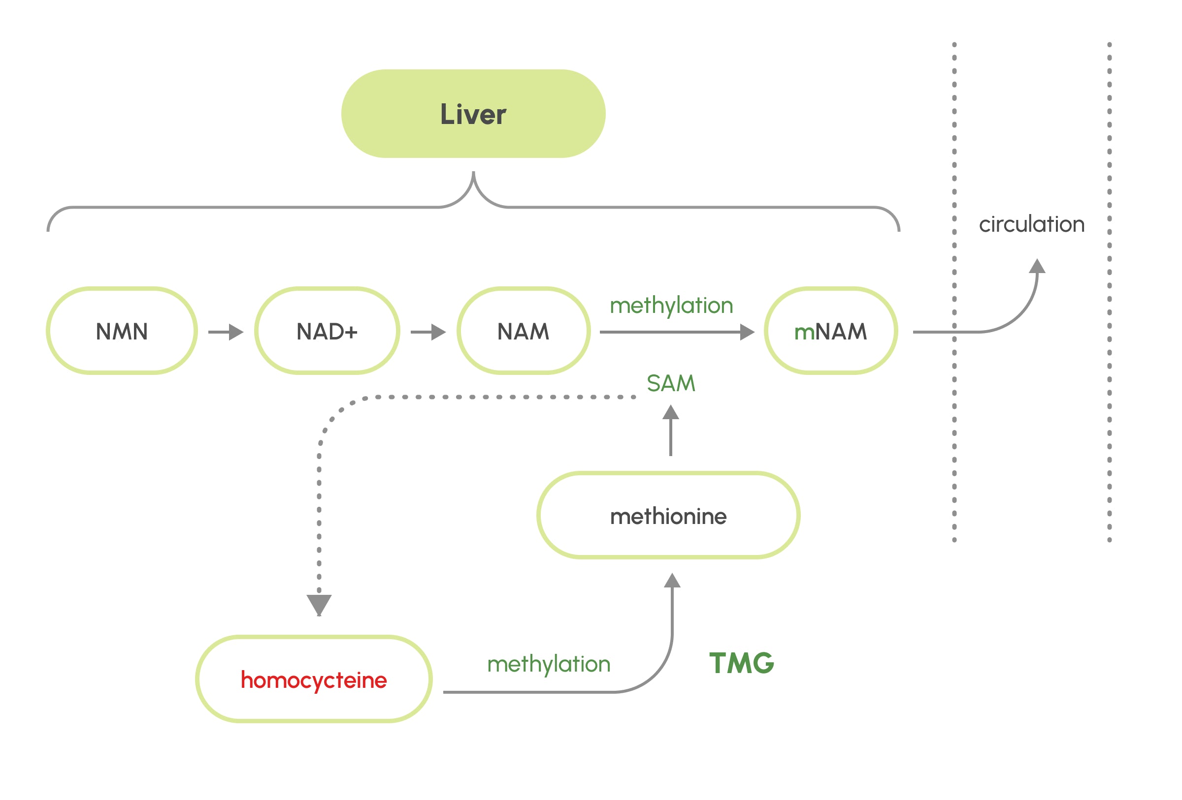 Erhöhte NAD-Spiegel nach NMN-Supplementierung führten zu einem höheren Bedarf an Methylgruppen für die mNAM-Produktion. Da der Methylpool in der Zelle begrenzt ist, empfiehlt Harvard-Professor Dr. David Sinclair, diesen durch die Einnahme von TMG (9) zu erhöhen. Obwohl TMG nicht der primäre Methylgruppendonator für mNAM ist, soll es dazu beitragen, das Gleichgewicht der Methylgruppen in der Zelle aufrechtzuerhalten. So gleicht TMG die Wirkung von NMN aus.